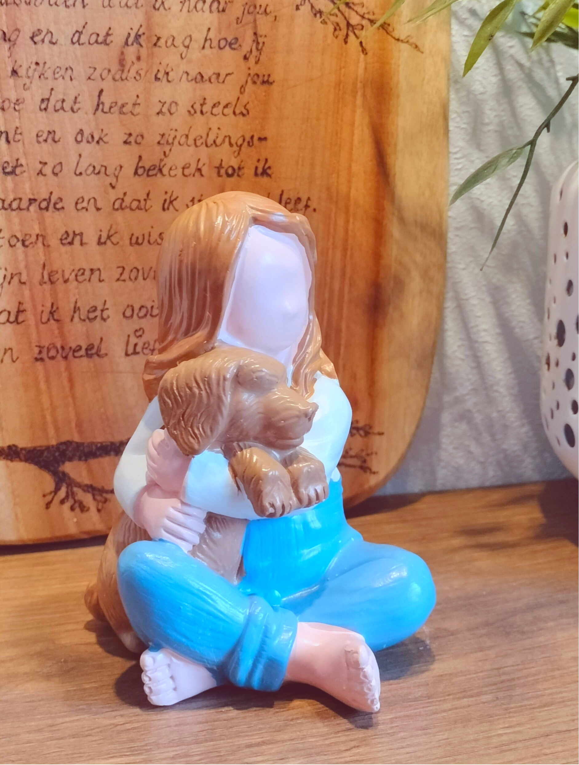 Liefdevol beeldje van meisje en hond. Handgeschilderd.